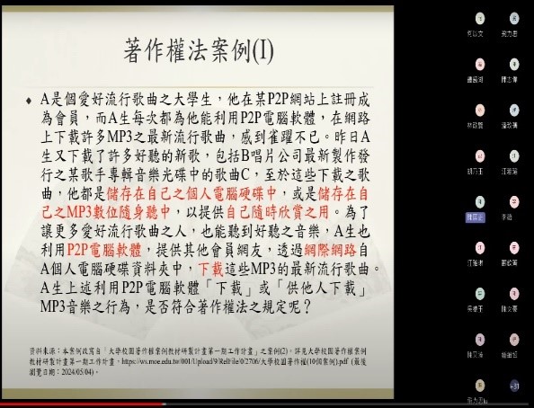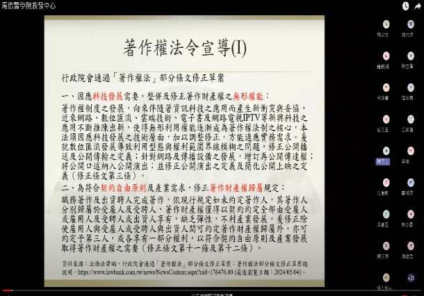 智慧財產權保護對於激勵創新和維護創作者權益至關重要。為提升本校教職員生對於智慧財產權重要性的認識與了解,邀請國立臺北科技大學智慧財產權研究所教授兼所長–陳匡正教授於113年6月12日在Teams舉辦線上講座–「校園著作權法及相關案例介紹」。