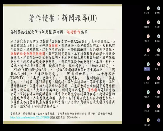 活動中教授分享他的見解和經驗,呼籲不僅要瞭解著作權法之規定,更要遵守著作權法,並讓參與者從實際案例中學習到智慧財產權的適用範圍和保護策略。