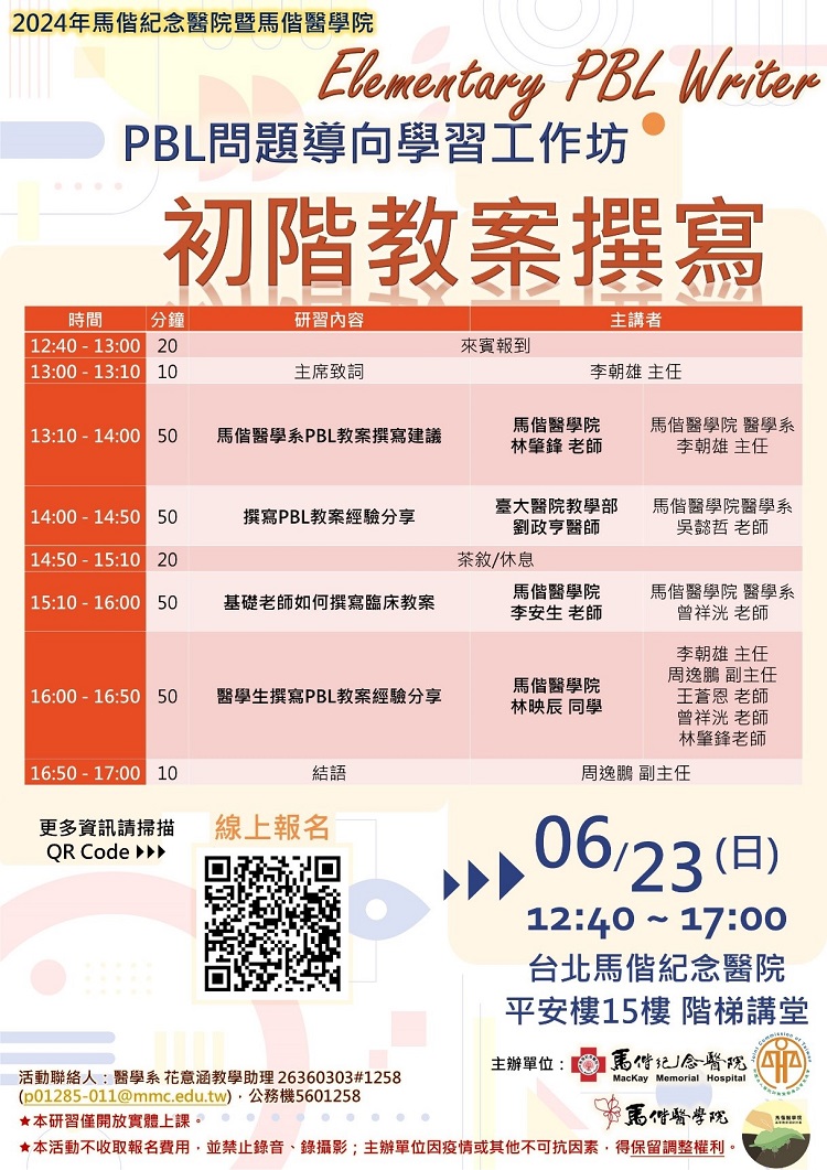 醫學系與馬偕紀念醫院醫學教育部教師培育中心於2024年06月23日共同於馬偕紀念醫院台北總院平安樓15樓階梯講堂舉辦「2024年以問題導向學習工作坊(PBL)─初階教案撰寫」,本次邀請到馬偕醫院心臟內科林肇鋒醫師來和我們分享馬偕醫學系PBL教案撰寫建議、臺大醫院教學部劉政亨醫師和我們分享撰寫PBL教案經驗分享以及馬偕醫學院醫學系李安生老師來與我們分享基礎老師如何撰寫臨床教案,讓學員了解到作為一個教案撰寫人,在撰寫教案時,應從何下手及如何擬定與課程銜接之教案學習目標。
