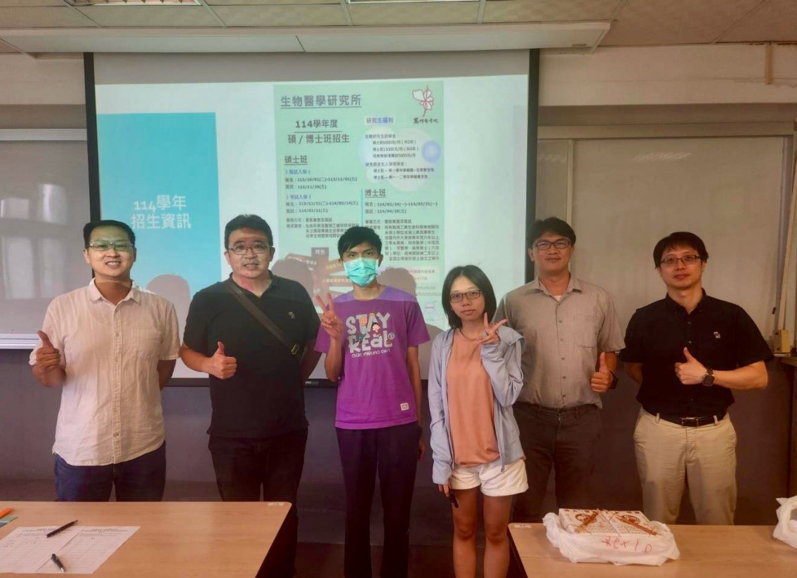為宣傳114學年度生醫所碩士班招生,生醫所林正勇等四位老師於113/9/23(星期一)前往大同大學化學工程與生物科技學系辦理招生說明會,對該系學生宣傳本所特色、優勢、師資研究以及114學年度招生考試時程,期望可吸引學生報考並增加校外學術交流。