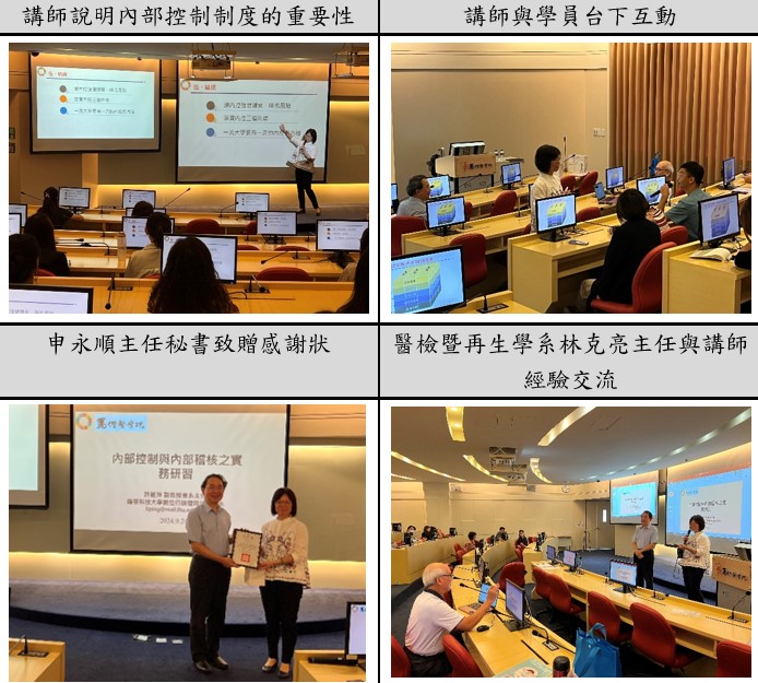 為持續精進校務內部控制制度與內部稽核作業之完善,秘書室於113年09月23日上午10-12時,假二期教研大樓四樓遠距教室舉辦「113學年度內部控制與內部稽核之實務研習會」,邀請龍華科技大學數位行銷暨跨境商務學系許麗萍副教授蒞校演講,藉以提升全體同仁校務品質保證意識,研習會由申永順主任秘書主持,共有46位教職員參加。