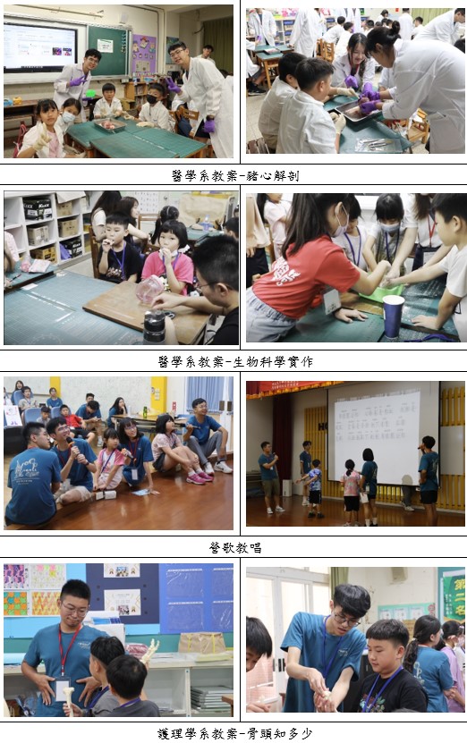 由於後龍鎮的資源相對匱乏,孩子們在學習過程中很少有機會接觸到醫學相關知識。為此,「馬偕小小醫學營」提供了多樣化的課程,讓孩子們能夠更深入了解醫學院的特色。我們設計的教案涵蓋了醫學、護理、聽語、視光等基礎知識,內容豐富,例如「骨頭知多少」、「豬心解剖」、「科學實驗」以及多種團隊遊戲活動等。透過這些課程,我們希望引導孩子們建立正確的醫學觀念,激發他們對醫療領域的興趣,同時擴展他們的視野。我們期待,這樣的教育活動能夠鼓勵更多苗栗地區的學子投身醫事領域,為社會做出貢獻。