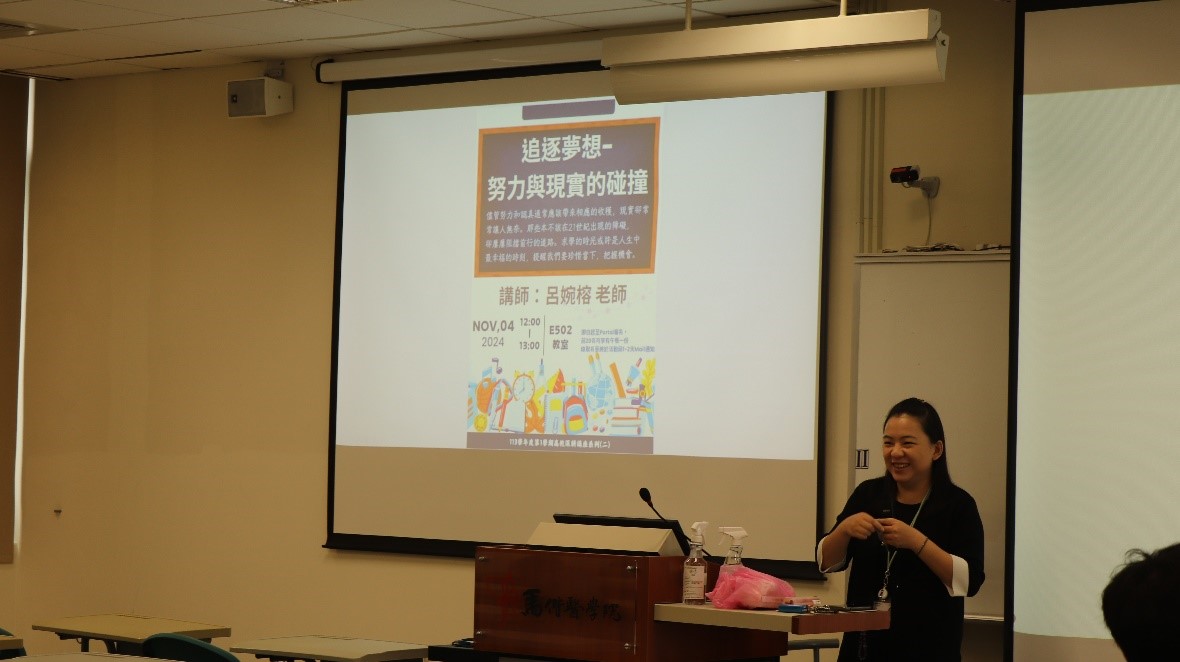 113年11月4日,高教深耕學思歷程系列的第二場講座順利舉行。此次特邀視光學系的呂婉榕老師,以《追逐夢想-努力與現實的碰撞》為題,分享了她在夢想追求與現實挑戰中的堅持與平衡。老師從大學時期便以成為一名老師為目標,並開始了豐富多彩的學術之旅。她的大學生活不僅限於學習,還充滿了娛樂活動與探索,讓她體驗到學術與生活的多元,也提醒同學們大學不僅僅是課業,更應勇於開拓視野、探索多樣的生活。