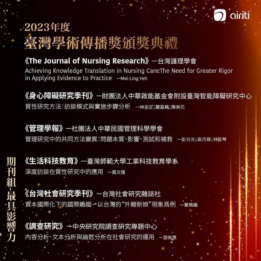 林金定教授的期刊論文《質性研究方法:訪談模式與實施步驟分析》因其在學術界的高度引用和影響力,獲得了華藝數位科技公司 (Airiti) 主辦的「期刊組最具影響力獎」。此論文刊登於《身心障礙研究季刊》,以深入分析質性研究中的訪談模式與實施步驟,為相關研究提供了寶貴的理論與實務指導。該獎項基於Airiti DOI 註冊期刊資料庫中引用次數最高的前六大期刊論文而選出,並於113年11月9日,在張榮發基金會舉行的「2023年度臺灣學術傳播獎頒獎典禮」中正式頒獎。