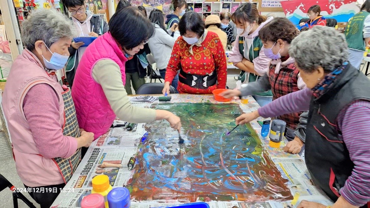 今天【藝術賦權:醫療場域的藝術軟實力】課程的學生於113/12/19帶著長輩們,豪邁、自由的將壓克力顏料隨意揮灑,再用滾輪、刮刀等將顏色任意混合,製造肌理。當色彩滾動範圍越來越大時,肩關節也跟著開展,心也寬闊舒坦,沒有人知道一起創作的色紙最後會是什麼樣子,剛開始有那麼一點擔心害怕,但是漸漸的感受到任意塗鴉的樂趣(偶爾能任性也是很幸福的事)。