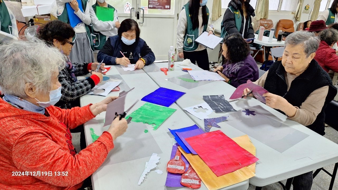 馬偕醫學院的學生們可是有備而來,幾乎全程台語,帶領著長輩們一起討論「家鄉」,從三芝講到台南,講山講海,講虱目魚、茭白筍,跟著長輩慢慢將心中那最美的家鄉圖像建構出來,再使用繽紛的色紙剪貼創作。有人仔細的畫下幼年時牽的那頭牛,有人順著色彩肌理的結構,剪出曼妙的櫻花樹,而年邁的阿嬤非常堅持要保護茭白筍田不被松鼠侵擾,邊創作邊敘事,完成作品很滿意地跟大家分享,學生們看到長輩的創意都自歎不如了。