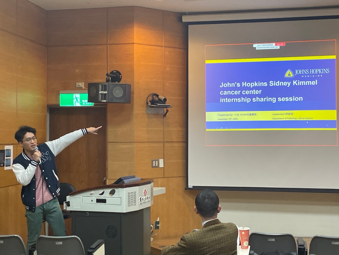 黃譯民同學分享赴美國約翰霍普金斯實驗室的見習經驗,以及在巴爾的摩兩個月期間的生活適應與安全管理,以及學習內容與研究心得