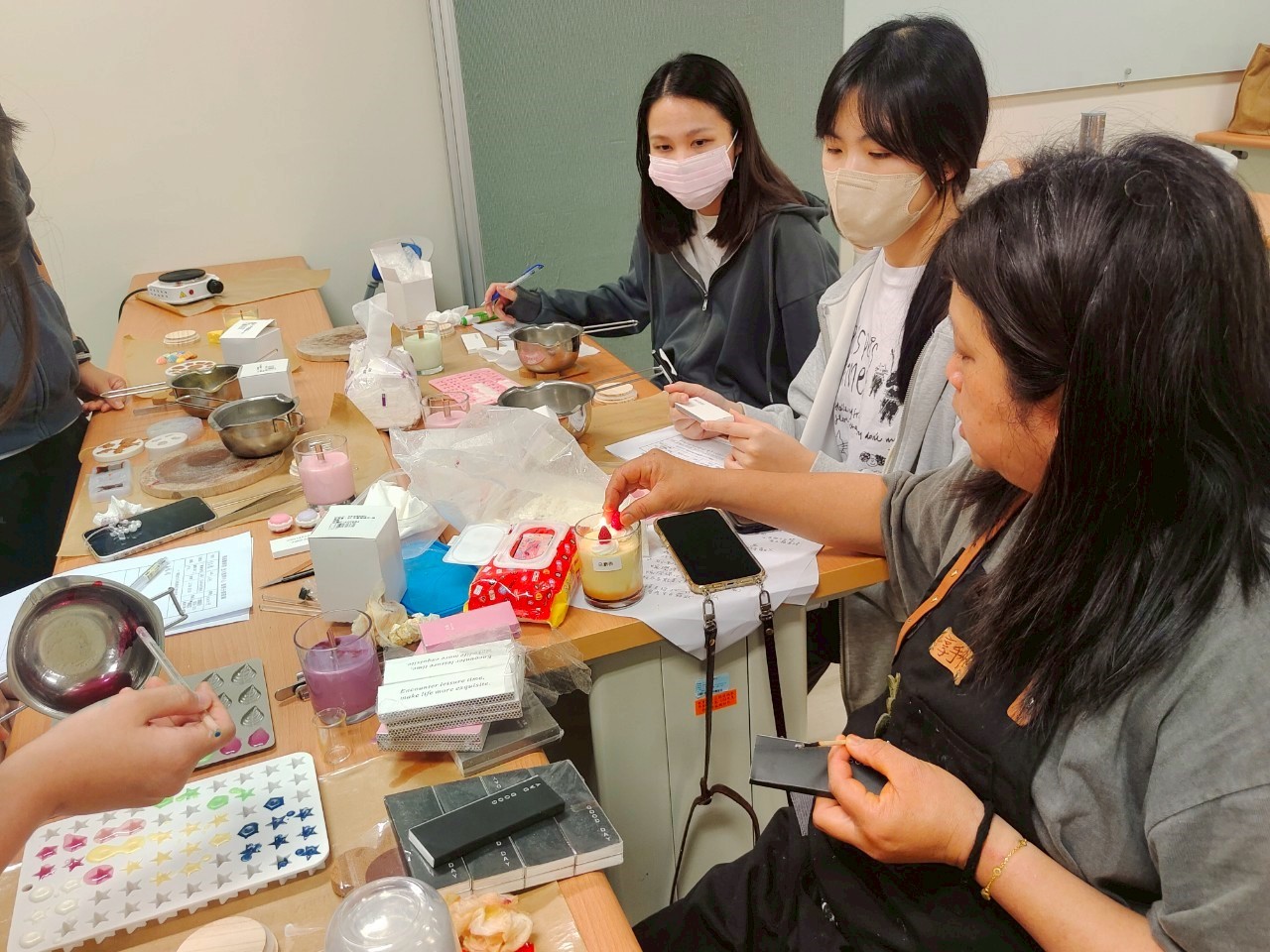 療癒香氛蠟燭DIY工作坊學生熱情參與反應熱烈。從香氛選擇到成品製作,每位學員都展現出高度投入與創作熱情。不同於一般成品購買,這次活動讓大家體驗從無到有的蠟燭製程,在實作中理解香氣如何影響情緒與空間氛圍,也學會了調製屬於自己的療癒香氣。