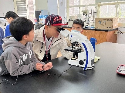 ▲醫學檢驗暨再生醫學學系楊宗穎助理教授協助金山國小與金美國小同學進行顯微鏡操作,並講解觀察內容