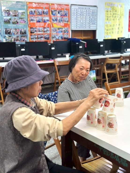 活動內容融合視覺刺激與身體協調訓練,安排了三段健腦遊戲影片及兩項互動式益智挑戰,分別為疊杯挑戰與舉旗遊戲,有效刺激長輩的注意力、專注力與記憶力。遊戲過程中,長輩們熱情參與,彼此加油打氣,現場氣氛活潑熱絡。