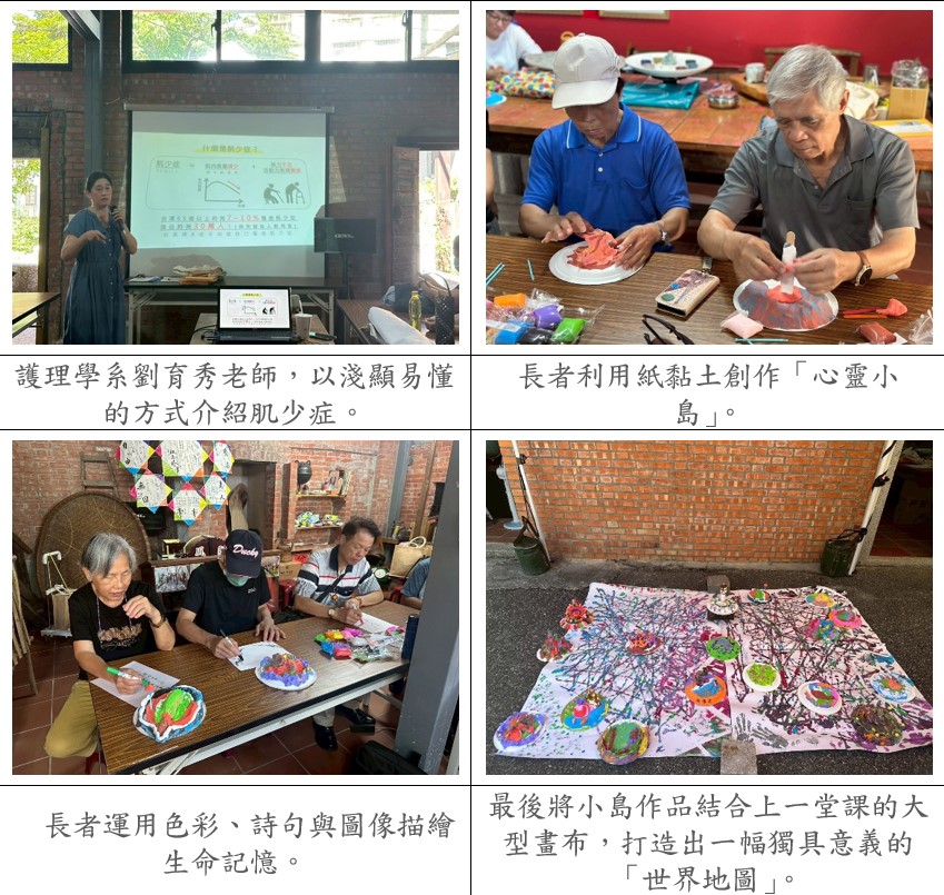 課程上半場由劉育秀老師開場,以淺顯易懂的方式介紹「肌少症的風險」、「口腔與吞嚥照護」及「恆毅力與健康生活的關聯」,協助長者建立基礎健康意識,提升自我照護能力。下半場則由林羿騏老師接手,引導長者透過紙黏土創作「心靈小島」,運用色彩、詩句與圖像描繪生命記憶。每一件作品皆承載著個人故事,有人書寫詩句,有人描繪童年場景,也有人透過創作抒發失落與盼望。