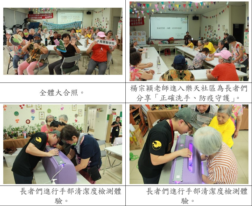 為提升社區長者的防疫意識與實作能力,本校醫學檢驗暨再生醫學學系楊宗穎老師,於114年6月12日前往樂天社區舉辦「正確洗手、防疫守護」課程活動,帶領長者實地認識日常生活中常見病原,學習正確且有效的洗手方式,共同守護自身與家人的健康安全。