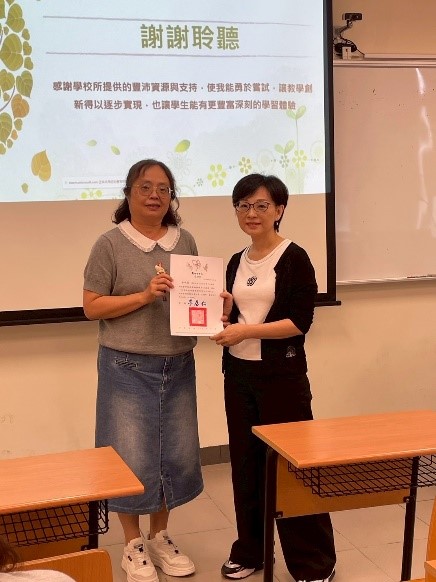 ▲教師發展中心陳貞蓉主任頒發感謝狀予講者余珮蓉老師