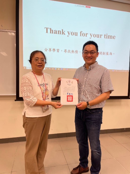 ▲教師發展中心陳貞蓉主任頒發感謝狀予講者周迪侖老師