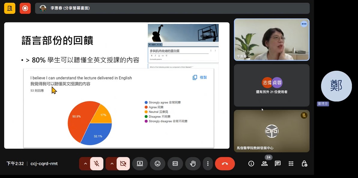 李老師分享如何以EMI融合專業內容與語言學習,強調課程設計須靈活因應學生背景與臨床需求,透過具體案例讓教師掌握關鍵教學策略。講座獲得與會教師一致好評,顯示EMI已成為醫學教育中重要的教學趨勢。