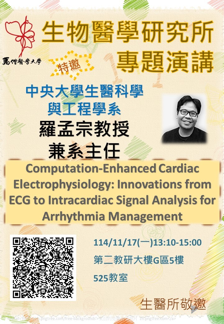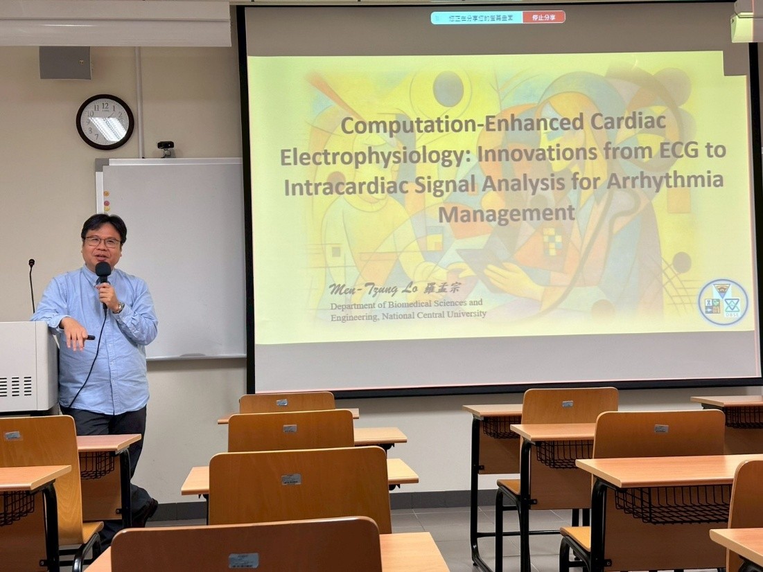 生醫所辦理114-1專題演講,於114年11月17日(星期一)下午1:10-3:00,在第二教研大樓G區5樓525教室舉辦。本次由洪崇烈老師敬邀中央大學生醫科學與工程學系羅孟宗教授,講題為:「Computation-Enhanced Cardiac Electrophysiology: Innovations from ECG to Intracardiac Signal Analysis for Arrhythmia Management)」分享其精彩的專業見解,豐富多元的學識內容,讓與會師生受益良多。