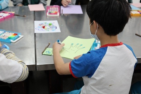 ▲三芝國小同學描下自己的手掌輪廓,發揮想像力把小手變身為獨一無二的情緒角色