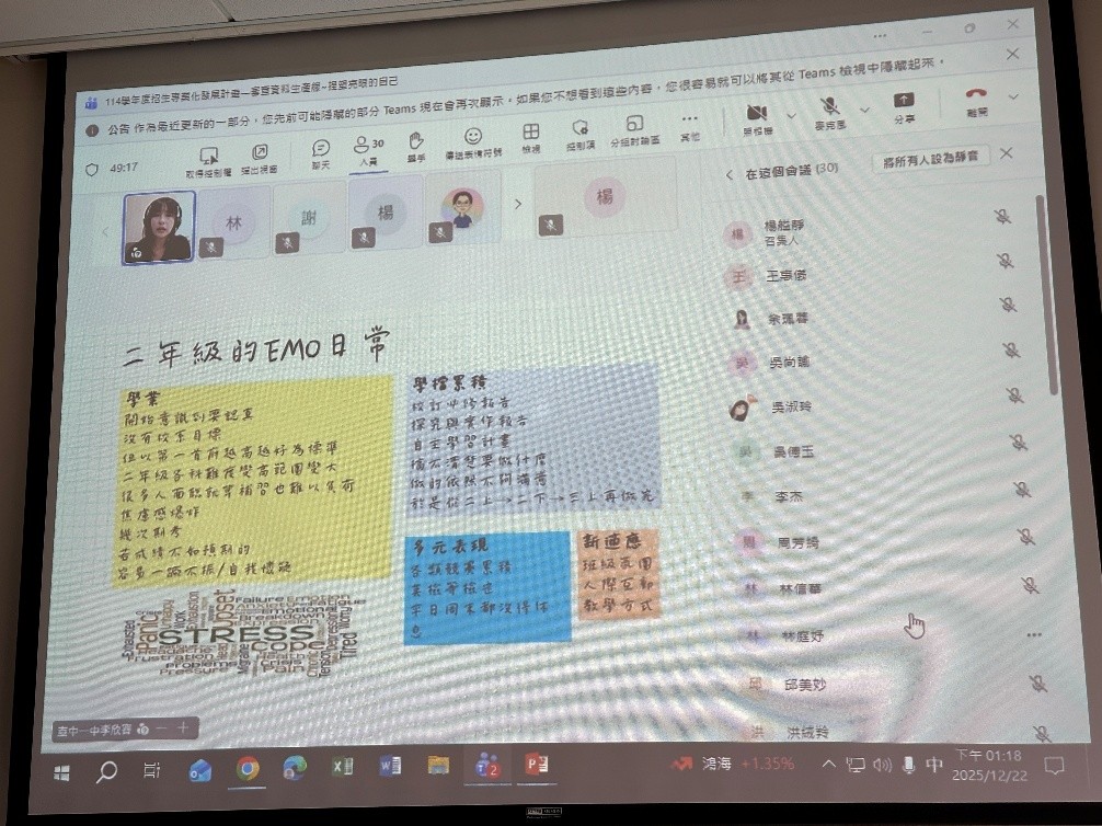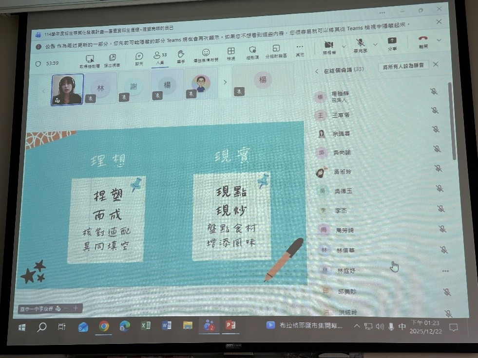 教務處招生組於 114 年 12 月 22 日 透過 Teams 線上辦理「114 學年度大學招生專業化發展計畫系列講座」,本次講座以「審查資料生產線-捏塑亮眼的自己」為主題,邀請臺中一中輔導室李欣容主任分享高中端在學習歷程與大學申請輔導上的實務經驗,協助本校教師與書審委員更深入理解高中端的實際需求與現行作法。