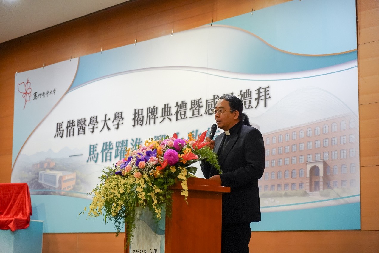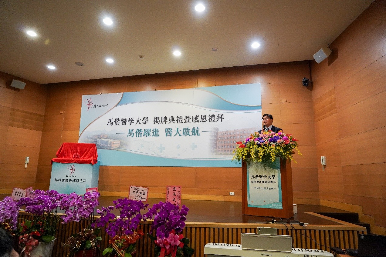 大會由戴約信董事長代表學校致謝,他由衷地感謝政府長官、企業先進及地方合作夥伴們等各界來賓,特別撥冗參加今天的盛會。他指出馬偕醫學大學的成立,是信仰與教育交織的結晶,是歷代信徒所禱告與耕耘的成果,除期許全校教職員生持守馬偕博士的初衷,無論在學術、研究或服務領域,皆能以基督愛人的心志,活出醫療宣教的召命,並邀請各界先進繼續給予學校支持與協助。