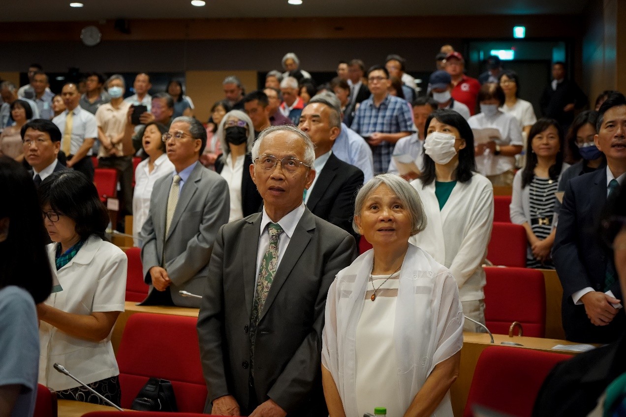 緊接著,由教職員詩班帶領全體會眾合唱馬偕醫學大學校歌《偉業薪傳》,表達對馬偕精神傳承不息的盼望與宣告:「遠渡重洋來台灣,宣教育才福音揚,謙忍卓決奉主行,基督之愛臨萬邦…」。詩歌不僅回顧馬偕博士當年遠渡重洋來台行醫宣教的壯志,也點燃與會者心中的感恩與感召之火。典禮尾聲,由董事會謝大衛董事祝禱,眾人一同低頭祈禱,為學校未來的發展與師生平安代求,全場以一片感恩與祝福畫下圓滿句點。