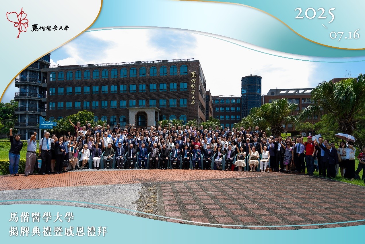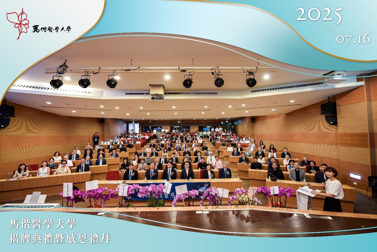 本校2025年7月16日(星期三)上午10時30分,於第二教研大樓2F國際會議廳隆重舉行揭牌典禮暨感恩禮拜。在敬虔莊嚴的詩歌聲中,來自各界貴賓、校內師生、教會代表齊聚一堂共約二百人,共同見證馬偕醫學大學邁向新里程碑的重要時刻。此次典禮特別彰顯基督信仰精神,以感恩禮拜為核心,回應上主恩典,引領本校醫學教育使命持續向前。