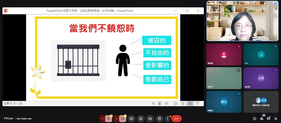 學務處今年執行114年度教育部高教深耕計畫,於114年08月19日(週二)以線上舉辦「為教師預約幸福—自助助人的情感課程」。今年教師品格營我們著重在「情感教育」上,因為情感教育、性平議題是近年學校教育的顯學∼備受重視,卻也顯著不足的學問。情緒暴走造成傷害的社會新聞時有所聞;令人嚮往的愛情卻不知怎麼開始、怎麼收尾。我們希望藉由今年的課程不僅能幫助老師預約幸福,也期待老師能在面對學生的情感議題時,不是迴避或批判,而是以成熟、健康的方式陪伴與引導。本次研習營透過四大主題,引導教師從「自我價值」出發,逐步進入「關係反思」與「情感療癒」,最終走向「愛的實踐」。在課堂中,教師們不僅獲得理論知識,更體驗到自我覺察與群體分享所帶來的安慰與啟發。當教師能先整理好自身情緒,便能以更成熟與穩定的心態,面對校園裡學生的早戀、失落與人際挑戰。這不僅有助於提升教學效能,更使教師成為學生生命中情感教育的榜樣與支持。