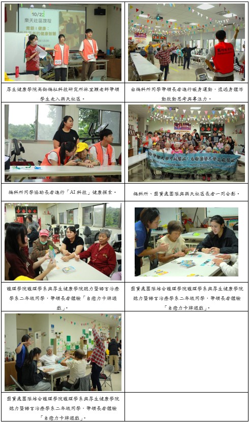 為推動青銀共學與健康促進教育,厚生健康學院高齡福祉科技研究所林宜穎老師帶領學生走入樂天社區,展開一場融合「AI 科技」與「青銀互動」的健康探索課程。