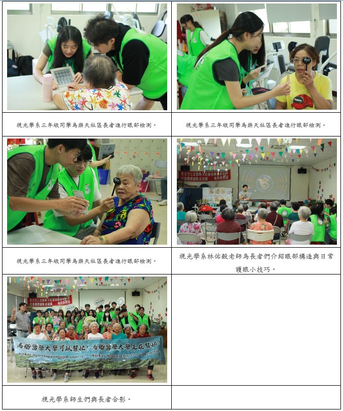 為推動社區健康促進與大學社會責任實踐,本校醫學院視光學系林佑毅老師於10月17日帶領三年級同學前往樂天社區,與長者們一同進行「眼睛健康小檢測」活動。