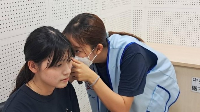 進行純音聽力篩檢,為同學佩戴耳機