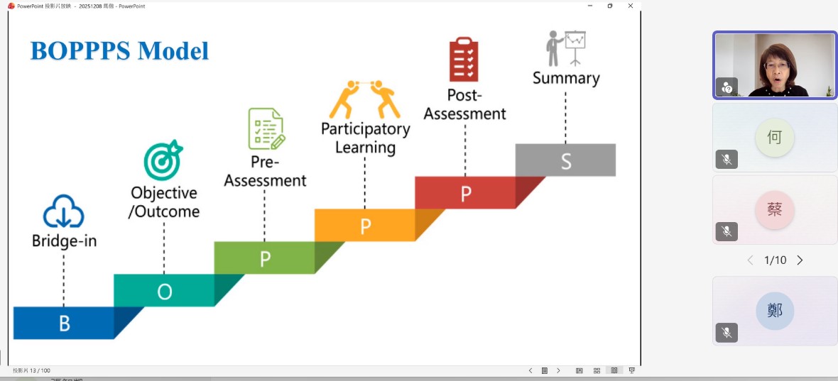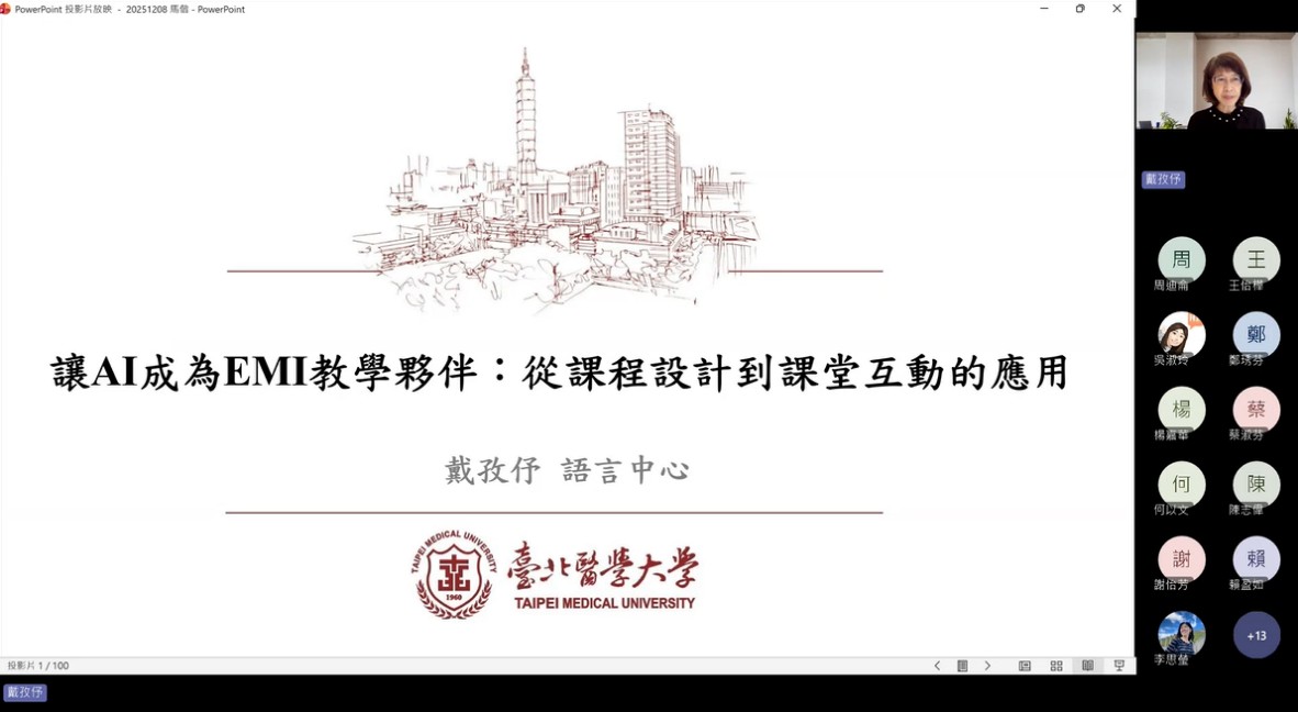 為協助本校教師掌握 EMI (English as a Medium of Instruction) 的教學精髓,並有效運用創新科技提升課堂成效,本校於 2025年12月08日舉辦「讓AI成為EMI教學夥伴:從課程設計到課堂互動的應用」教師增能研習。本次研習由臺北醫學大學語言中心戴孜伃老師主講,課程內容深入探討EMI的核心概念、教學重點,以及AI工具在備課、教材設計與課堂互動中的多面向應用。