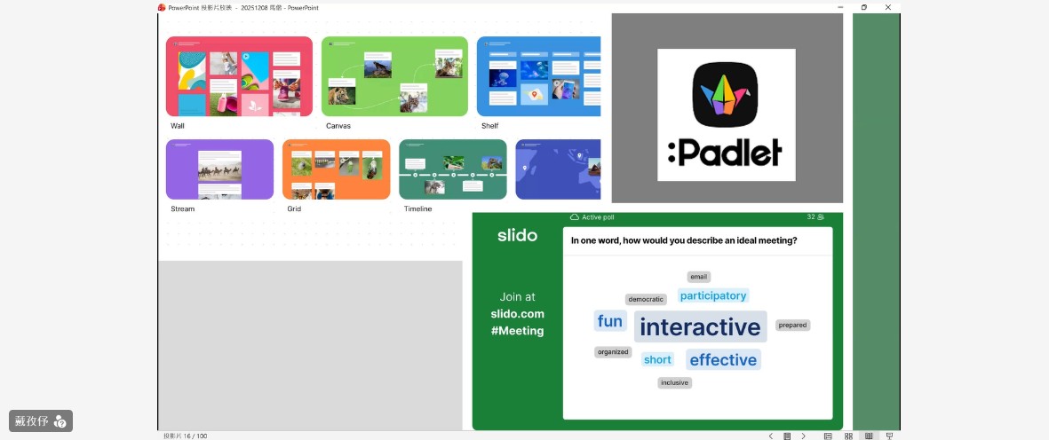 研習中介紹了多款實用AI工具,在備課與教材製作上提供了極大幫助。例如,Felo和Gamma等工具能協助教師快速將文字內容轉換為PPT簡報架構,提高備課效率;同時也討論了如何將AI導入 BOPPPS教學模式,以系統性地設計出更具互動性與效率的EMI教案。此外,酷英篇章口說評測系統在口說專區的實際應用,也讓老師們掌握了提升學生英語口語表達能力的有效工具。