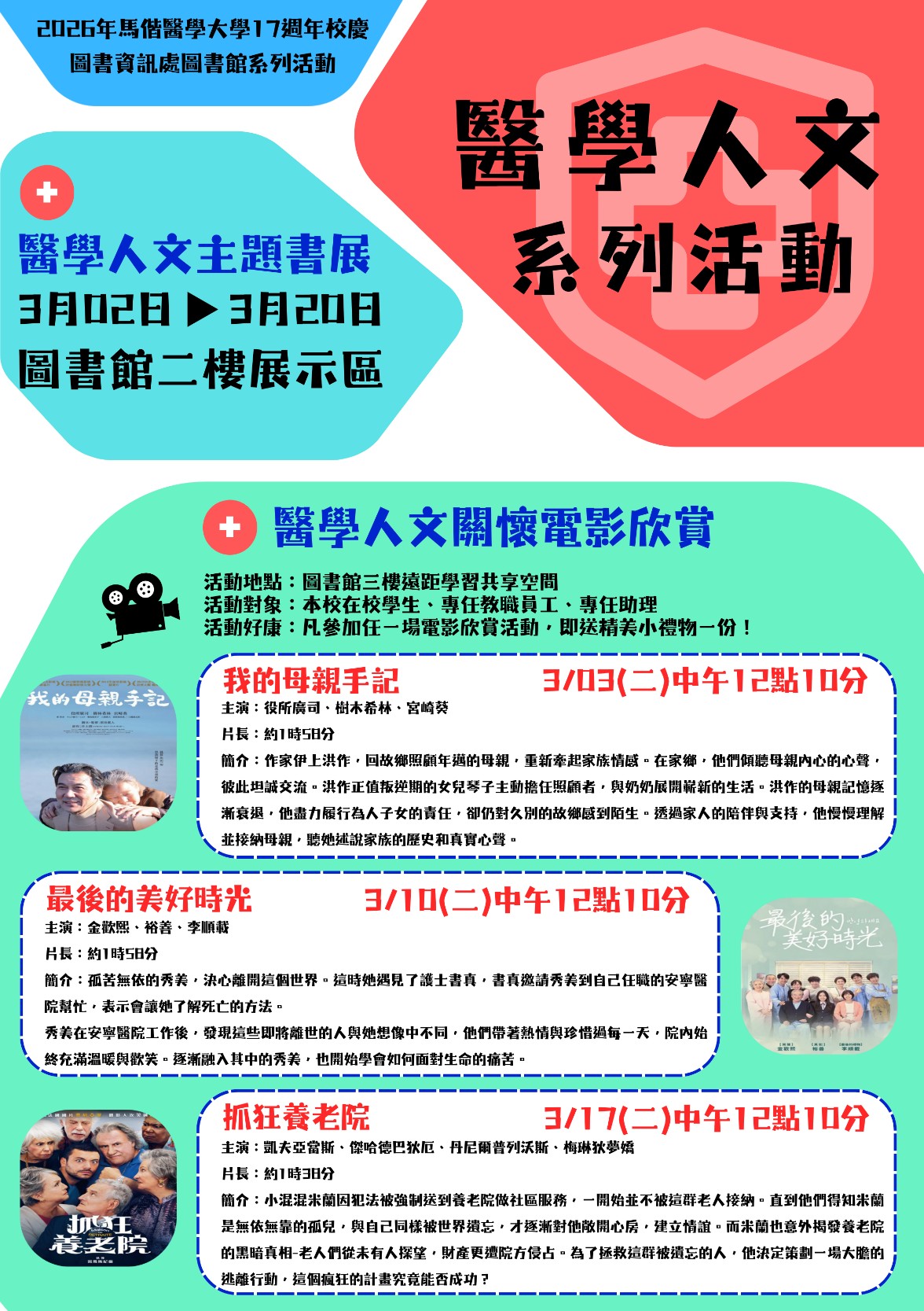 二、醫學人文關懷電影欣賞 活動地點:圖書館三樓遠距學習共享空間 活動對象:本校在校學生、專任教職員工、專任助理 活動好康:凡參加任一場電影欣賞活動,即送精美小禮物一份!
