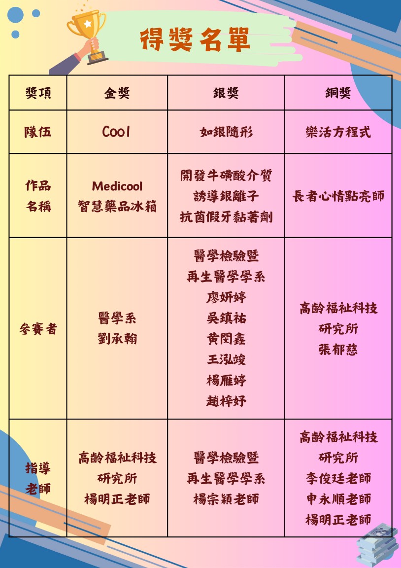 本屆醫療創意競賽共有39位同學,計18隊參賽,恭喜「Cool」隊伍以主題「Medicool智慧藥品冰箱」獲得金獎。