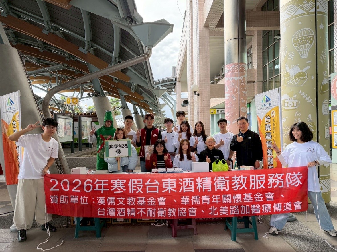 本次服務隊時間為(1/22~1/27),隊員人數共14人。營期中還有聽語系許益超主任及醫學系五年級林明哲學長前往探訪。主要服務地點在人潮眾多的東基院內、台東火車站戶外廣場、鐵花村波浪屋、家樂福水果街以及台東馬偕醫院。向路人介紹酒精不耐症、乙醛代謝與飲酒致癌風險。由於場域開放,我們會遇到各種不同背景的人,每位對象的生活方式與飲酒習慣都不相同,也讓每次的衛教都充滿挑戰與變化。對服務隊成員而言,這也是一次成長的旅程。初次參與者常常對街訪感到緊張,不知道如何向陌生人開口,也不確定如何在短時間內有效傳達訊息。然而,透過一次次的嘗試與團隊合作,大家逐漸提升溝通能力,學會觀察不同對象、調整說法,並在面對拒絕時保持自信與耐心。這些經驗讓服務不再只是付出,更是累積人際應對與公共溝通能力的寶貴機會。
